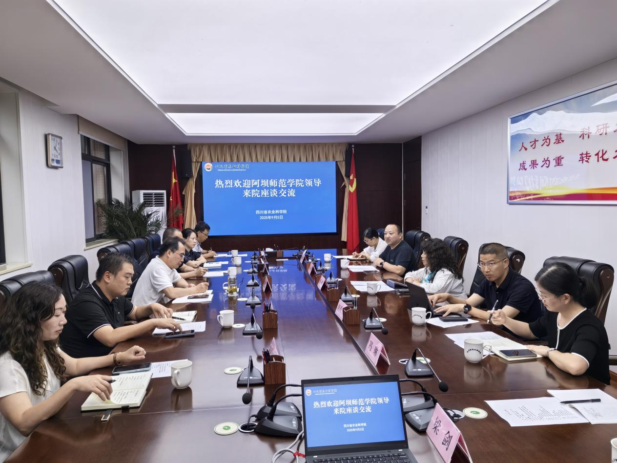 【本网讯】 9月5日下午,学校党委书记衡彤率队赴四川省农业科学院(以下简称“省农科院”)进行工作交流,旨在深化校院合作,共谋教育发展新篇章。省农科院党委书记、院长牟锦毅率院科技管理处、科技合作处、资环所、园艺所果树研究中心等相关职能部门负责人热情接待并参与座谈。阿坝师范学院党政办公室、科研与学科建设处、资源与环境学院负责人随行参加。